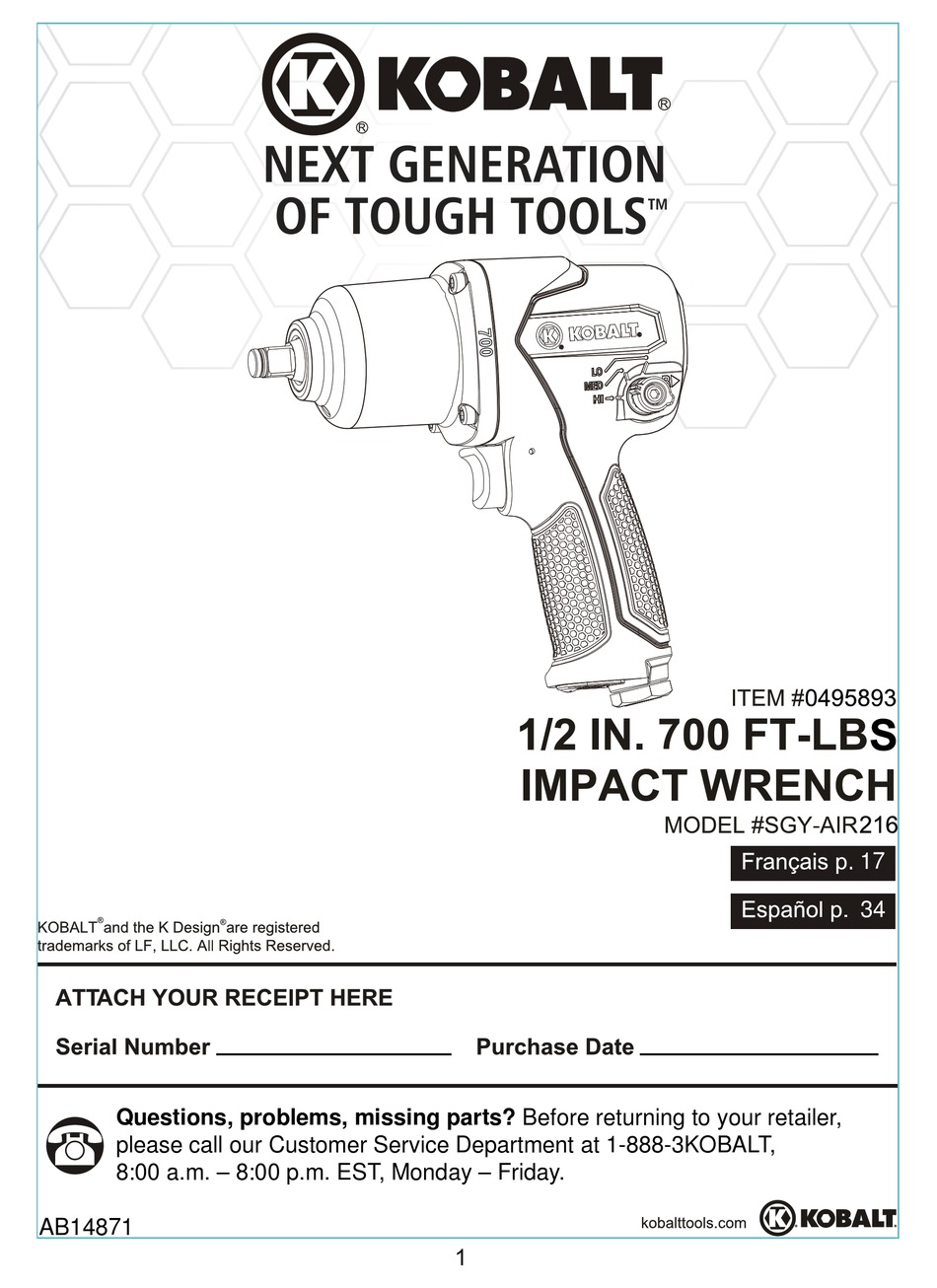 Kobalt Air Impact Wrench Pneumatic 38-in Drive 0375-in 350-ft Tool Gun. FREE Shipping by Amazon. Kobalt Impact Driver 0382461 Operating instructions manual 14 pages 3. Assembly And Operating Manual. If you have any questions please call our Customer Service. Get it as soon as Wed Feb 17.